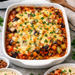 A hearty vegetable bake with soft eggplant, mild chayote, and protein-rich lentils in a savoury tomato base. Perfect as a nourishing main or side dish.